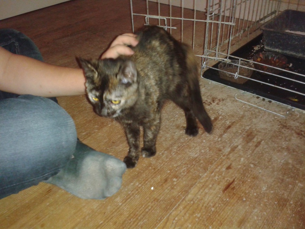 Message de Lourdès (rebaptisée depuis son entrée en accuei) « l’humaine a commencé à jouer avec moi avec un plumeau… je ne sais pas pourquoi j’aime bien les plumeaux… surtout qu’elle est futée l’humaine, elle a mis des hormones sur les plumes… du coup je me suis laissée toucher par le plumeau… c’était sympa les gratouilles de plumeau… puis l’humaine a mis sa main dans ma cage, ça fait pas mal, ça donne à manger et à boire. Du coup je me suis approchée, doucement et j’ai découvert que les gratouilles de main, c’est vachement bien ! conseil à tous mes congénères qui ont trop peur de l’humain… « essayez, ça vaut le coup ». Maintenant j’ai peur des bruits, je gronde si ça en fait trop, mais une main tendue et hop câlins assurés ! il parait que j’ai même une adoptante en vue. Je souhaite le même bonheur à tous mes amis chats de la rue »
