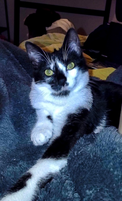 « La petite va bien, elle a exploré une partie de la nuit (être enfermée toute seule c’est pas drôle) et elle essaie de jouer avec note matou qui ne sait pas encore comment il doit réagir ».