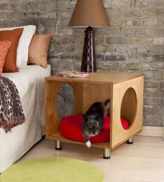 #4 – Un cube en bois + des pieds + un coussin = une table de chevet et le chat qui ne dort plus dans votre lit