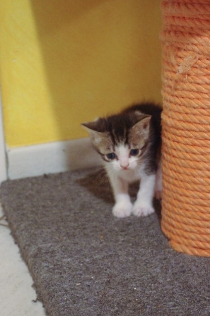 Mapi fait parti d’une portée de 4 chatons (avec Maki, Motus et Moustique). Ils sont encore avec leur mère et sont en cours de sevrage.