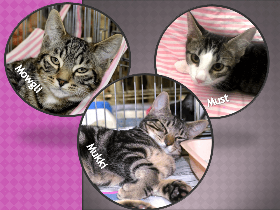 – Couleur : gris tigré (Mowgli – adopté), gris foncé tigré (Mukki), tigré et blanc (Must – adopté)
