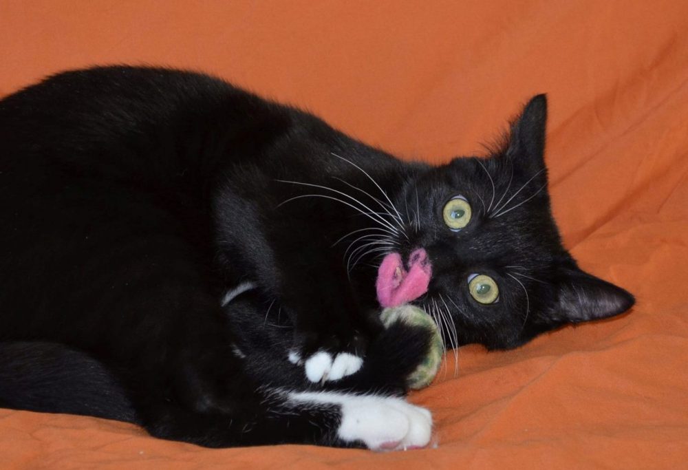Ma nounou dit de moi que je suis mignonne comme tout et que je suis très douce. Je suis d’un beau poil noir qui brille avec une touche de blanc aux quatre pattes.