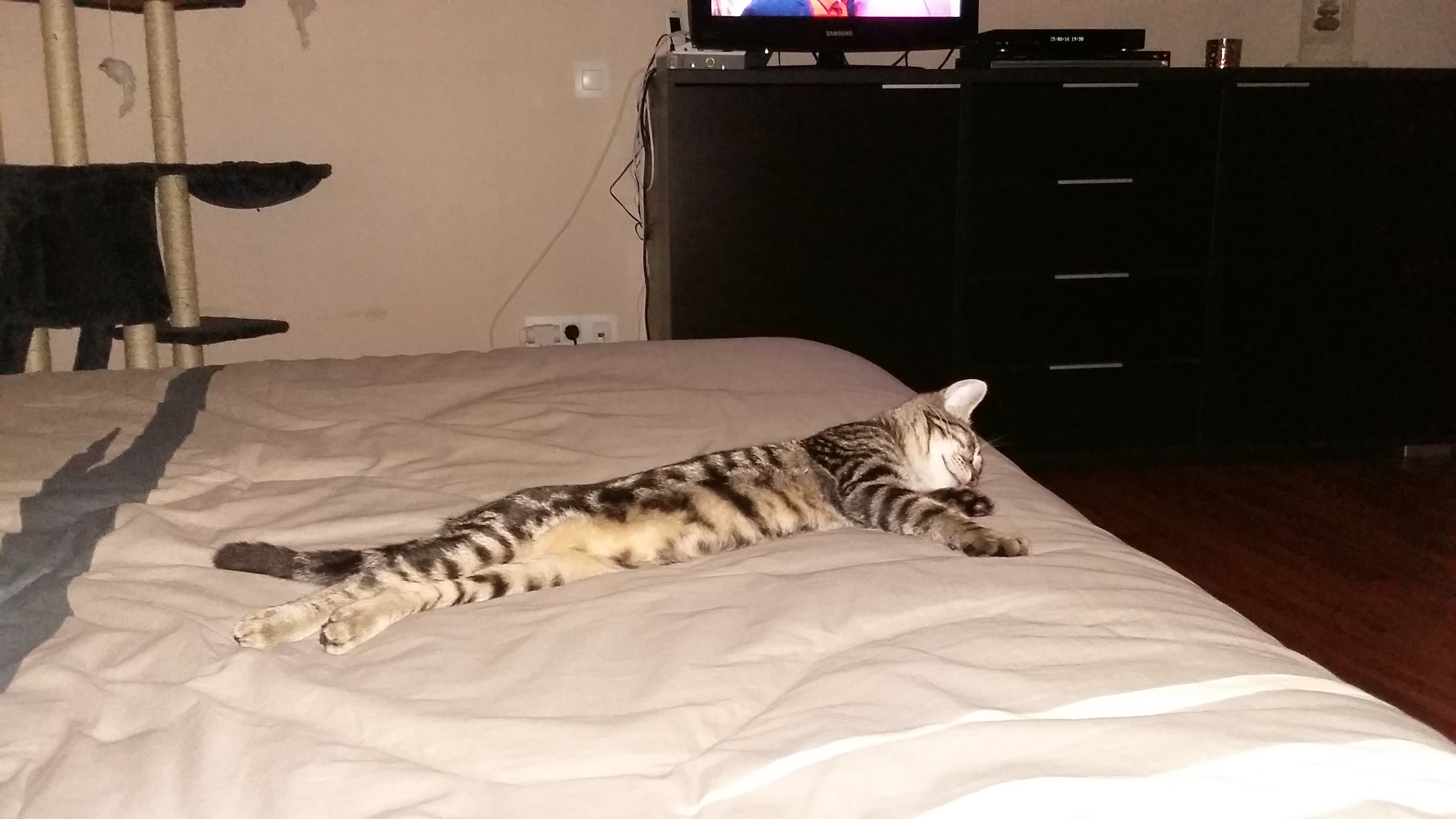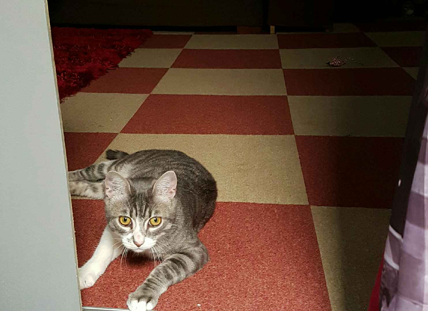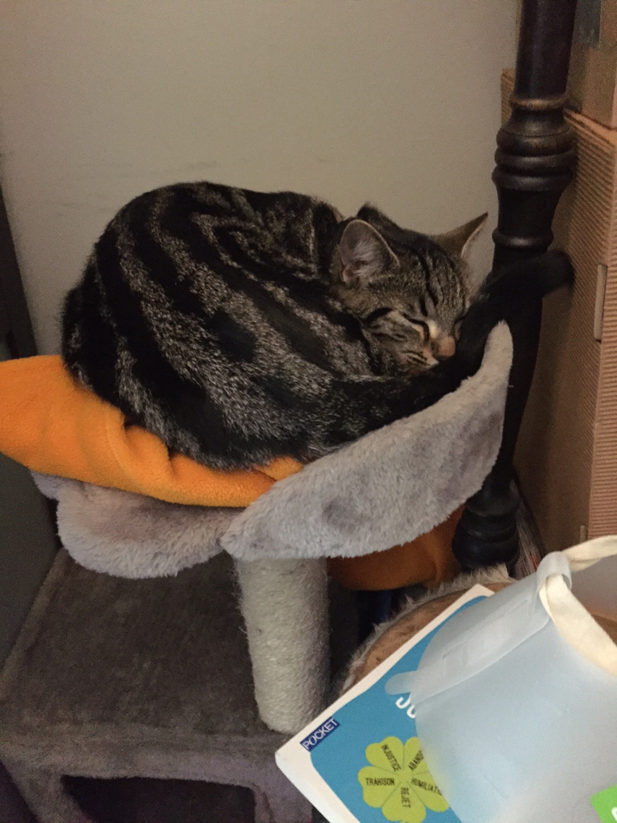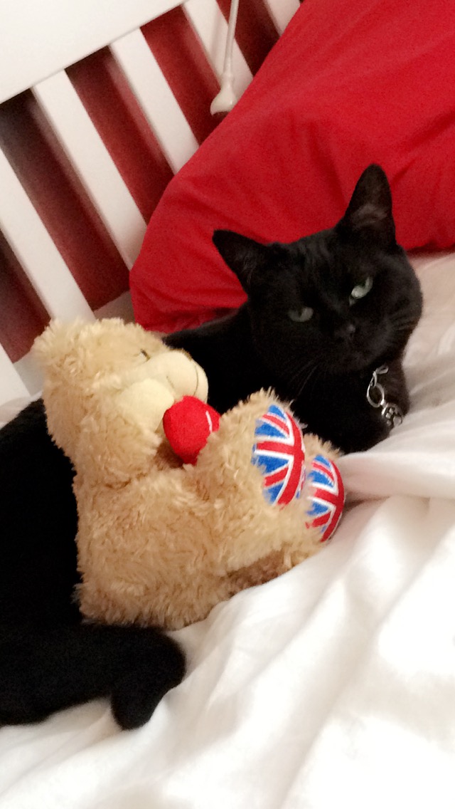 Ils sont gentils, la nuit je dors avec eux sur leur lit, pour manger j’ai plein de pâtée et de croquettes, j’ai ma litière dans ma chambre, des jouets, j’ai une maison, mon arbre à chat avec ma résidence secondaire. Mais j’ai tellement de choses à faire que j’ai pas le temps d’y dormir ! J’ai découvert tout leur sous sol, leur grande cave où il y a plein de cachettes, des coussins, des bains de soleil, un vieux coffre, c’est super pour moi.
