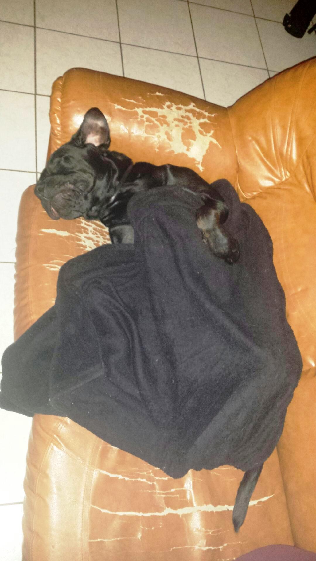 « C’est un amour, elle a fait connaissance avec mes deux chats sans rien dire. Elle est allée toute seule dans son panier et la journée l’ayant épuisée elle ronfle sur le canapé. »