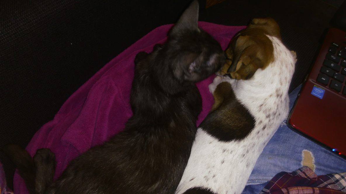 « Aujourd’hui, c’est sieste en groupe… elle a un bec sucré, elle nous pique les couteaux plein de confiture… elle semble avoir définitivement accepté sa nouvelle famille dont son « grand frère »…la petite crapule négocie tous les soirs pour dormir avec nous… »