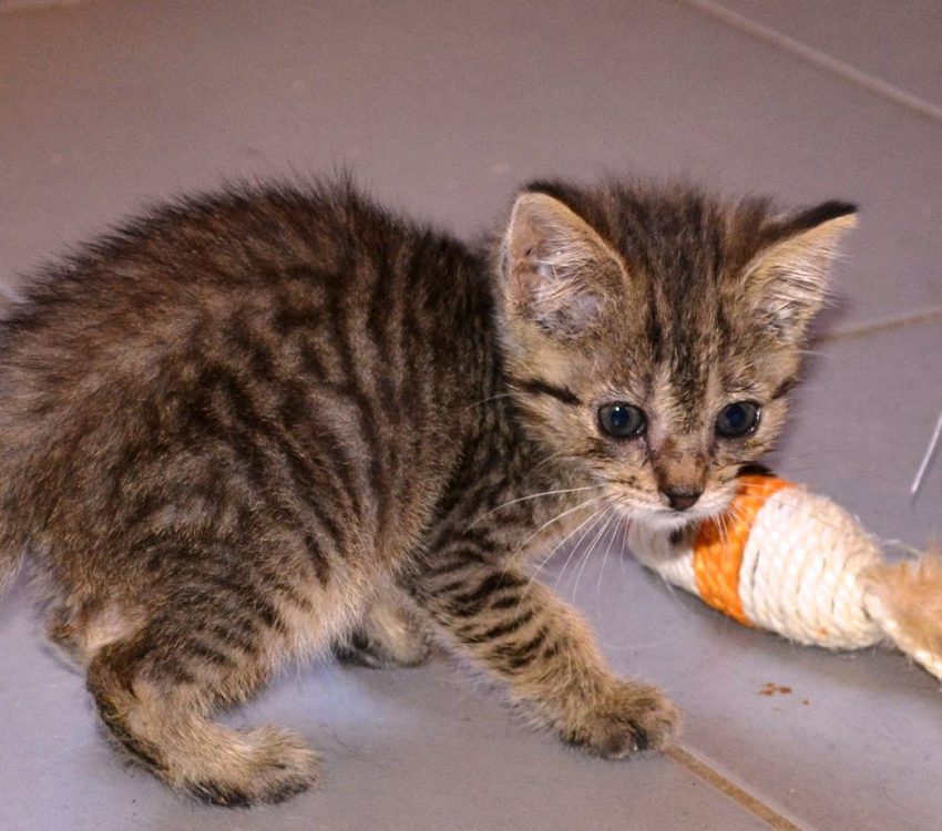 Microbe s’est accrochée à la vie et la voici pleine de peps et d’énergie… elle sort encore les griffes en jouant, il est donc préférable qu’elle ne soit pas adoptée dans une famille avec de tout petits enfants…