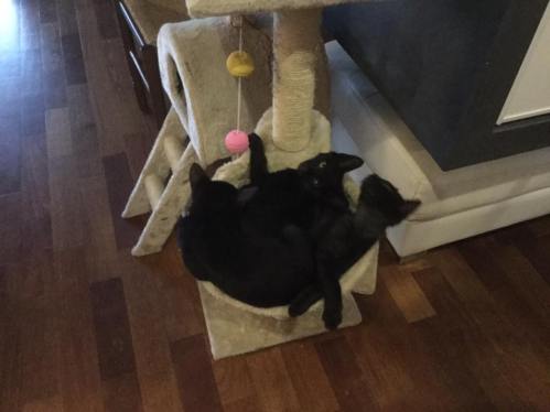 Ninocheka porte une robe magnifique – noire avec des reflets gris – digne d’une impératrice. Pas hautaine pour un sou, cette petite puce est adorable, propre (son rang oblige !) et très joueuse (même avec les chiens !).