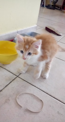 Issue d’une fratrie de 6 chatons, Nayonne est très belle avec ses longs poils. Mademoiselle est plus joueuse que câline et elle est habituée aux enfants.