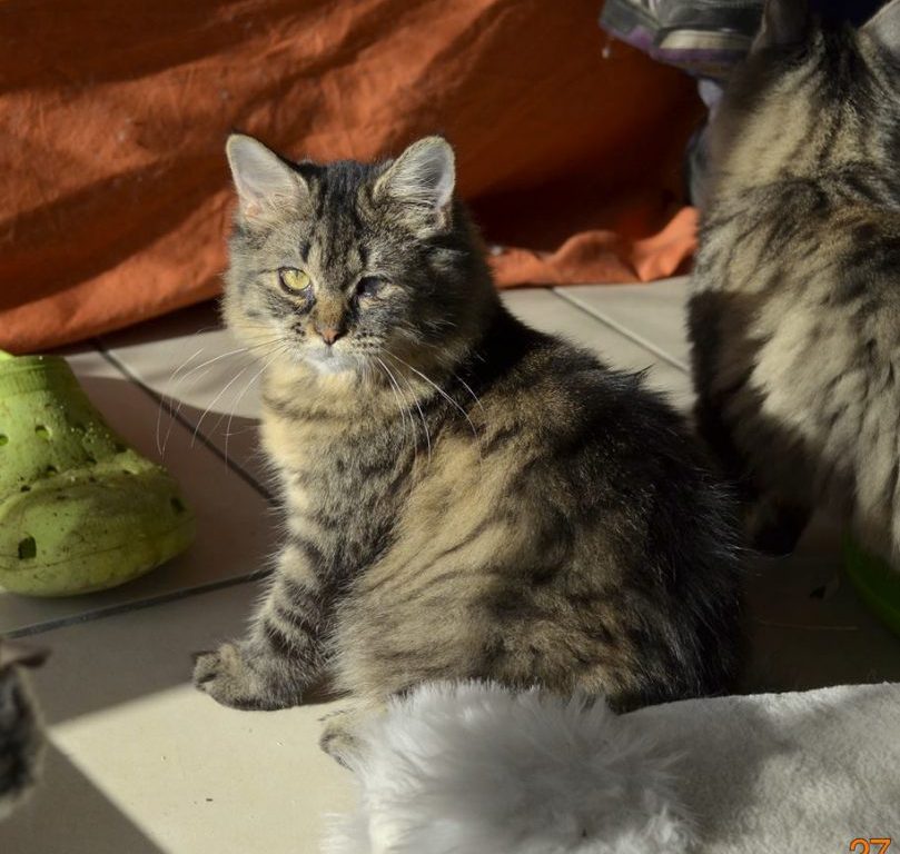 Nous avions le poids d’un chaton de 3 semaines alors que nous en avions 7… A cela s’ajoutait un gros coryza qui s’était attaqué à nos yeux qui en gardent désormais la trace.