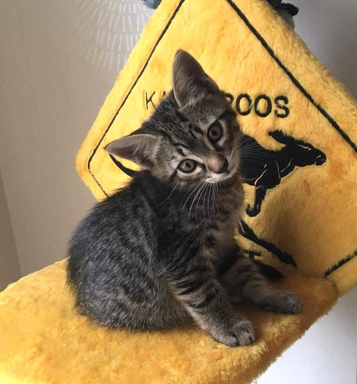 Voici Nax, tout juste 3 mois, petit mâle tigré à poils courts aux grands yeux maquillés de blanc. Il a grandi sereinement avec sa maman allaitante et ses deux soeurs.