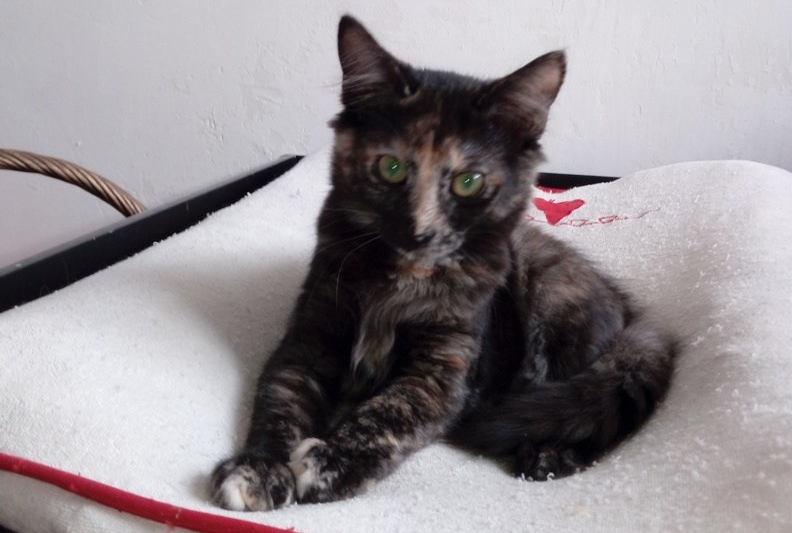Praline est une chatonne encore un peu timide mais qui adore les caresses et ronronne de plaisir. Elle a un superbe regard, une robe écaille aux poils mi-longs fournis et très doux.