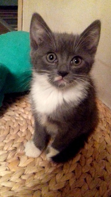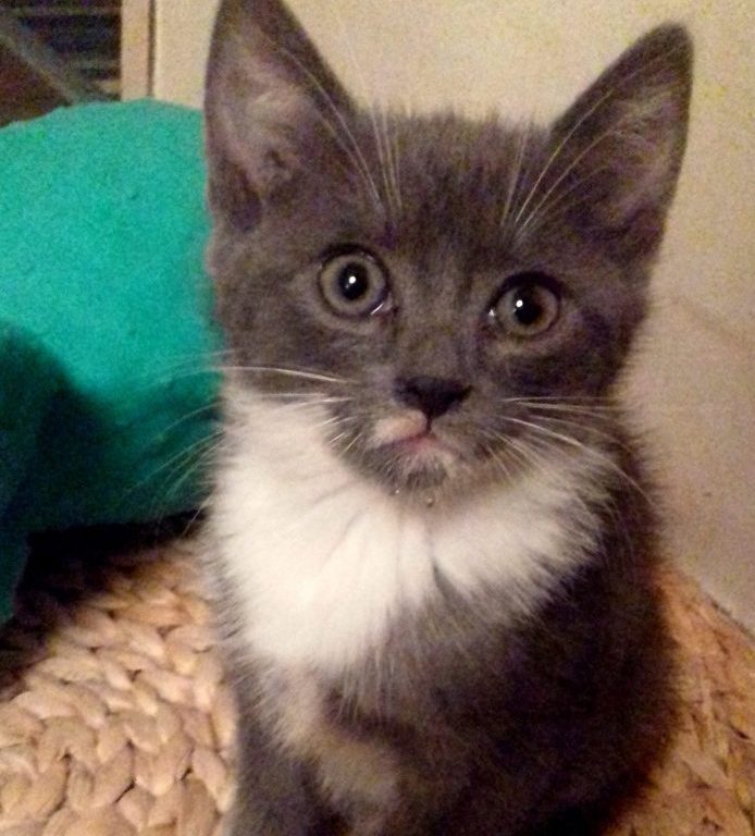 une robe grise à 80%, 4 chaussettes blanches pour pattes, un joli plastron blanc poils mi-longs qui orne son cou et des petites tâches roses qui parsèment sa truffe…