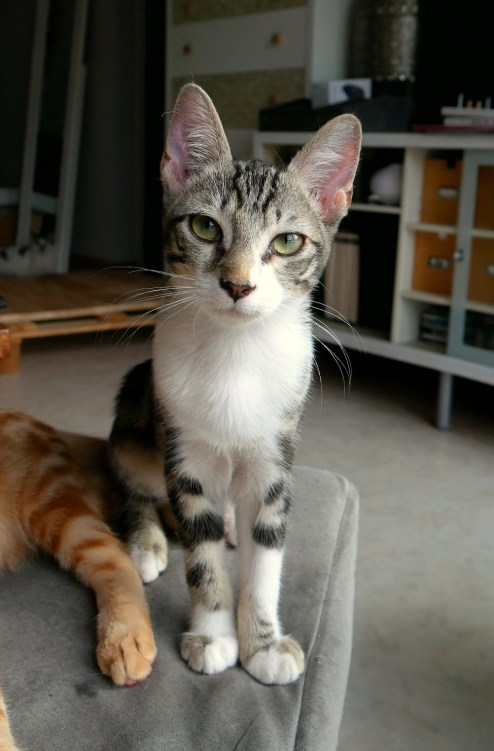 Et quel regard ! De grands yeux de biche magnifiques. Un tout petit miaulement mais un regard intense qui vous fait sentir coupable. Pourquoi ne pas lui donner un p’tit morceau après tout ?