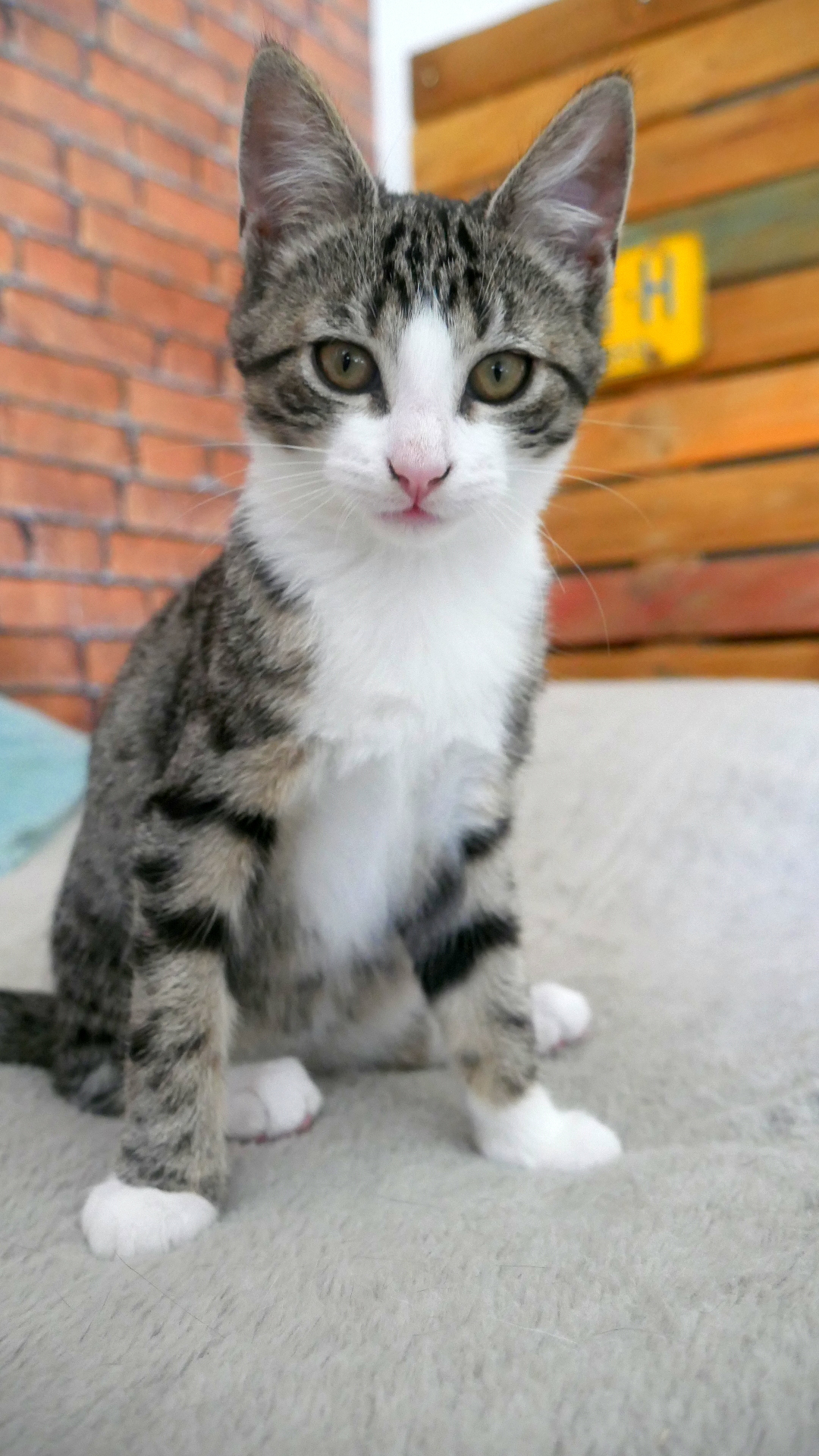 Comme tous chatons, elle aime jouer. Elle est très vive et la plus rapide pour attraper la balle ou la souris. Elle grogne quand elle tient sa proie.