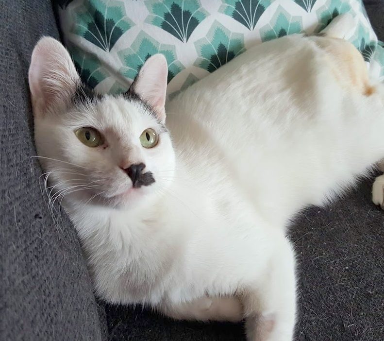 Ce loulou adore les câlins (il guette les genoux pour pouvoir s’y lover) et c’est une sacrée bonne pâte : il s’entend avec tous ses congénères, même avec Tigrette (c’est peu dire car la demoiselle a un fichu caractère !)