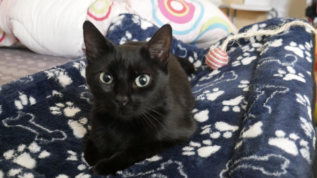 Pêche est une magnifique petite chatte noire, calme et très aimante.