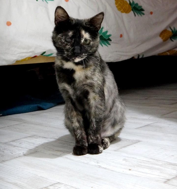 De son passé difficile, la petite Pastille garde un oeil voilé qui ne la fait pas souffrir et ne la gêne en rien. C’est son petit truc en plus.