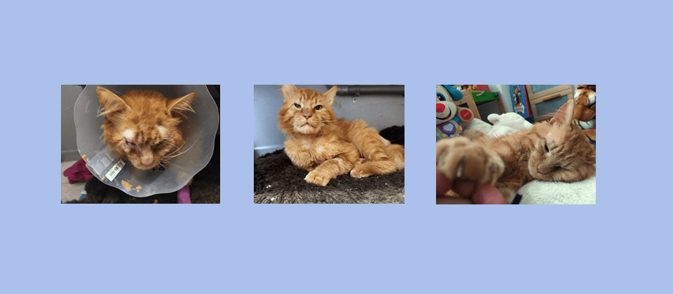Pour l’heure, il se remplume : de 2,5 kg à son arrivée chez Céline, il pèse dorénavant 4,2 kg. Débordant de gratitude envers ses sauveurs, il n’a de cesse de ronronner et de les suivre.