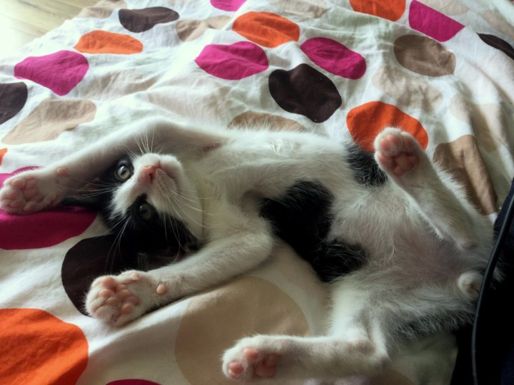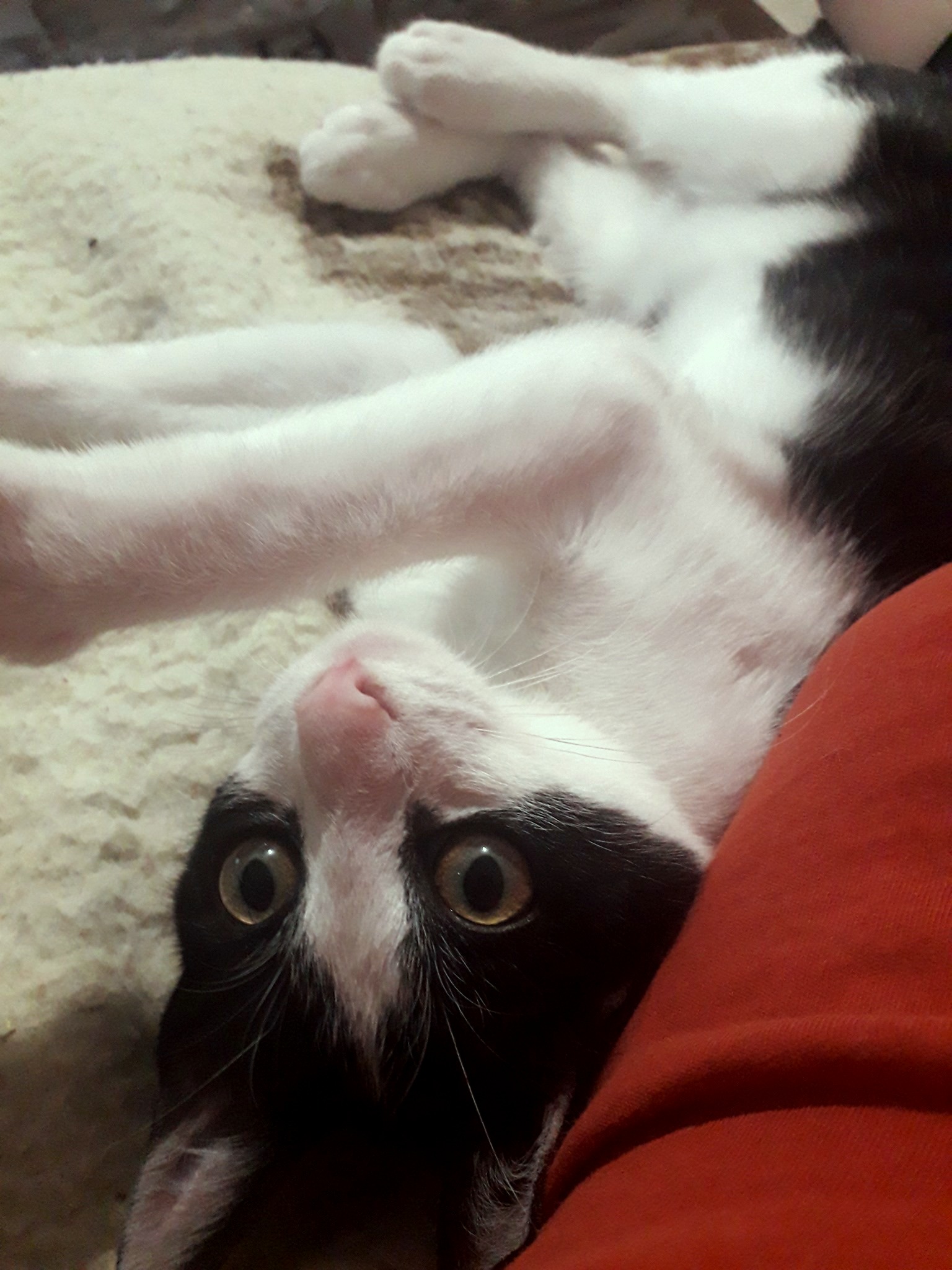 Bien qu’il soit plus joueur que câlin, Rescue est également proche de l’humain dans ses temps plus calmes. Il est trop mignon quand, réalisant que sa nounou n’est plus dans la pièce, il s’arrête de tourbillonner et miaule fort pour l’appeler.