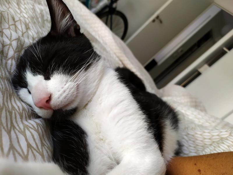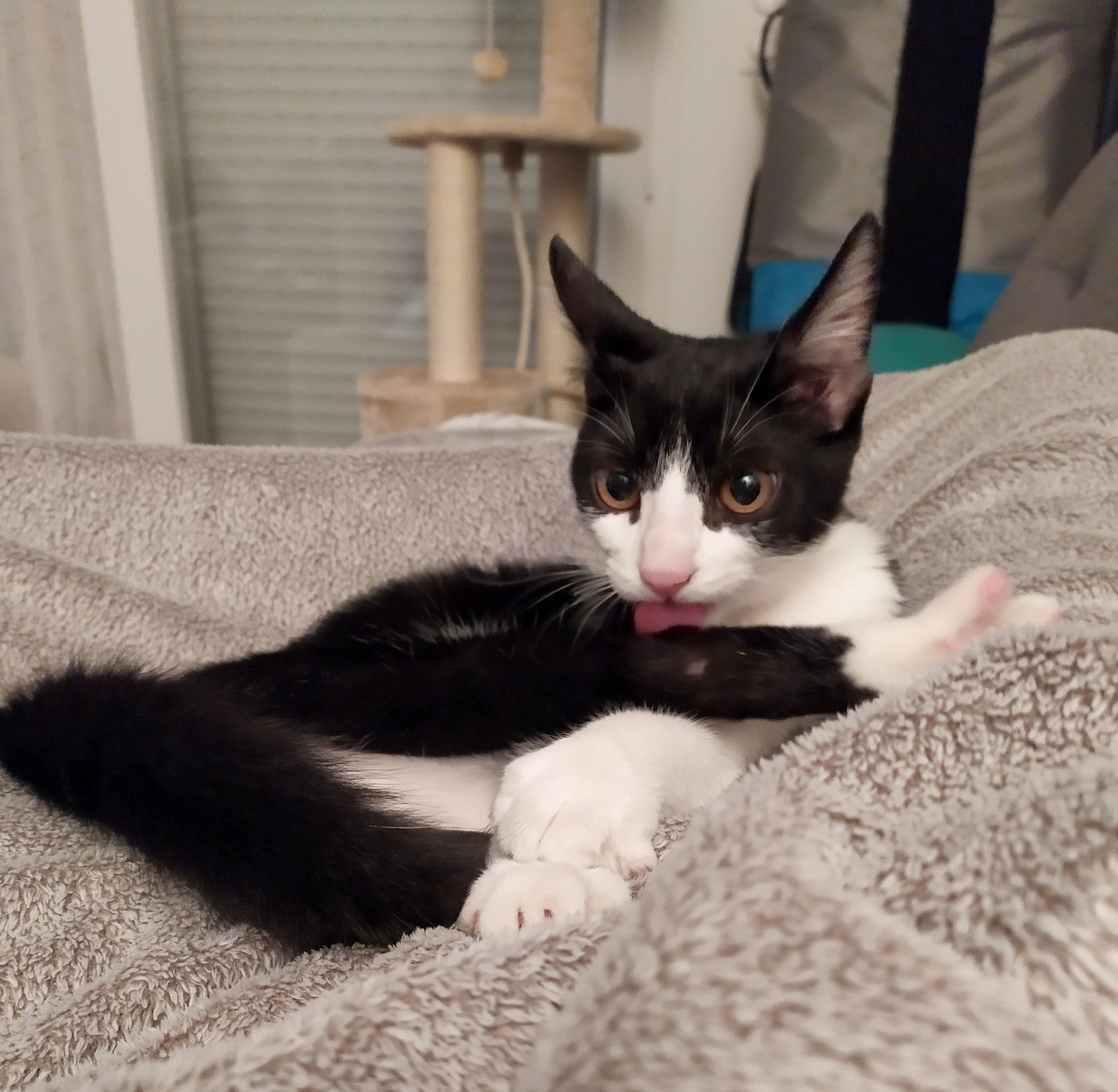 Ronie est un chaton de six mois extrêmement câlin et joueur qui a besoin d’attention. Il suffit d’un regard pour qu’il accoure pour demander une caresse. Il adore la compagnie et est sociable. Il aime se coucher sur les jambes de sa nounou pour y faire sa sieste. Alerte, il suit sa nounou un petit peu partout.