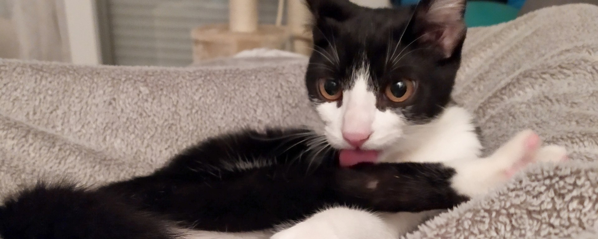 Ronie est un chaton de six mois extrêmement câlin et joueur qui a besoin d’attention. Il suffit d’un regard pour qu’il accoure pour demander une caresse. Il adore la compagnie et est sociable. Il aime se coucher sur les jambes de sa nounou pour y faire sa sieste. Alerte, il suit sa nounou un petit peu partout.