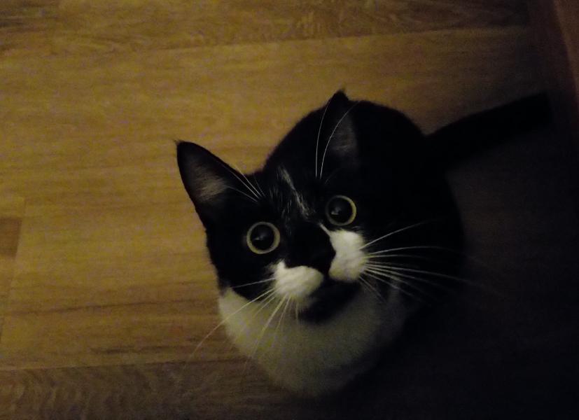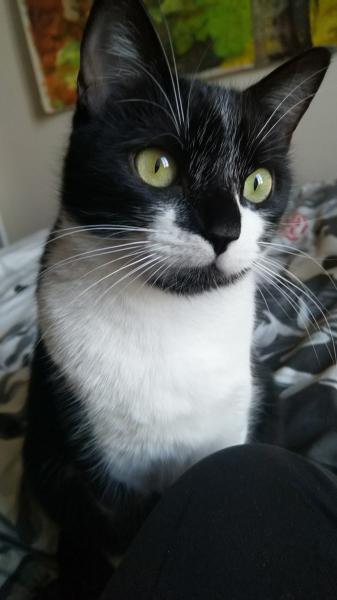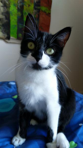 J’ai un joli pelage tout doux avec de grandes moustaches blanches. Je suis très bavarde et