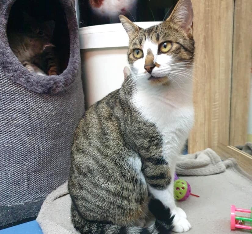 Une fois ses petits adoptés, elle s’est révélée être très câline, un brin pot de colle et un soupçon bavarde.