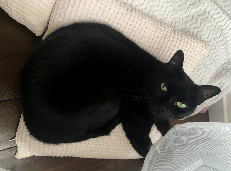 La demoiselle aime se poser dans un endroit tranquille pour faire une petite sieste. Le soir elle dort bien sagement dans son panier au pied du lit de sa famille d’accueil et ne vient pas sur le lit.