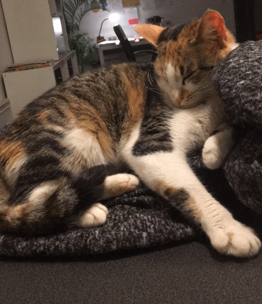 Pirouette adore suivre son humain partout, de la cuisine à la salle de bain en passant bien sûr par tous les endroits où une petite sieste au contact d’un humain bienveillant pourrait avoir lieu… et inutile de penser pouvoir dormir sans elle, elle trouverait le moyen de gagner le lit le plus confortable de la maison.