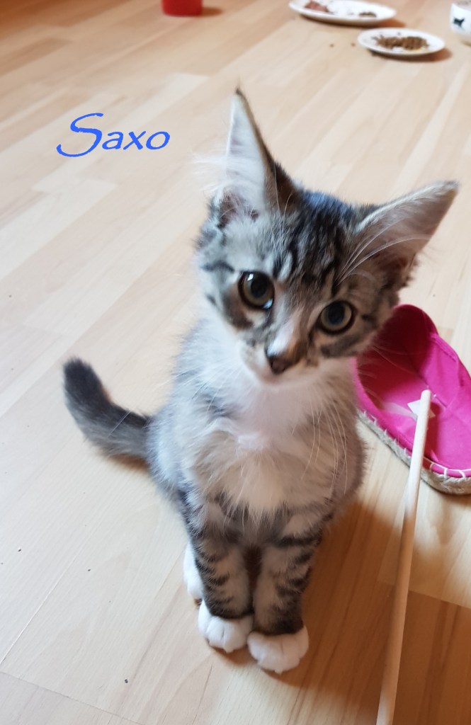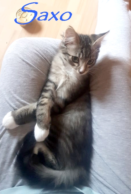 Saxo est un amour de chaton, fan de câlins qui vient en chercher dès que sa nounou s’assied. Il adore dormir collé contre elle dans le lit en ronronnant.