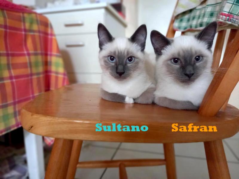 Safran et Sultano sont très complices et adorent jouer tous les deux. Ils se ressemblent comme deux gouttes d’eau, mais on peut les distinguer par la couleur de leurs pattes : marron pour Safran et blanc pour Sultano.