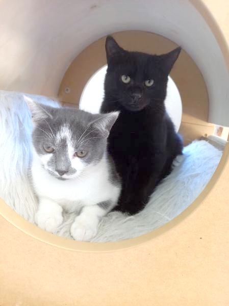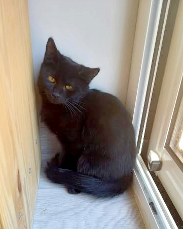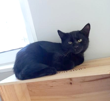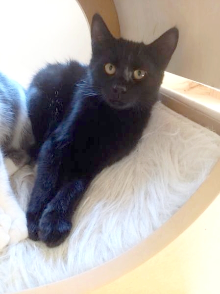 Scoubidou est un jeune chaton noir avec une tâche blanche sur le ventre qui ronronne très facilement et fait le dos rond quand on le caresse. Très sociable avec les autres chats.
