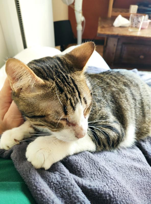 Razmoket est identifié, stérilisé, testé fiv/felv négatif, vacciné typhus/coryza et déparasité.