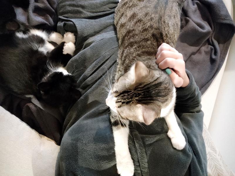 Ce n’est qu’après l’adoption de son frère très sociable qu’il a pu trouver sa place et se rapprocher de sa nounou Chloé. Il a eu besoins de quelques semaines d’observation pour prendre ses marques et venir vers elle pour partager des moments câlins et dormir avec elle.
