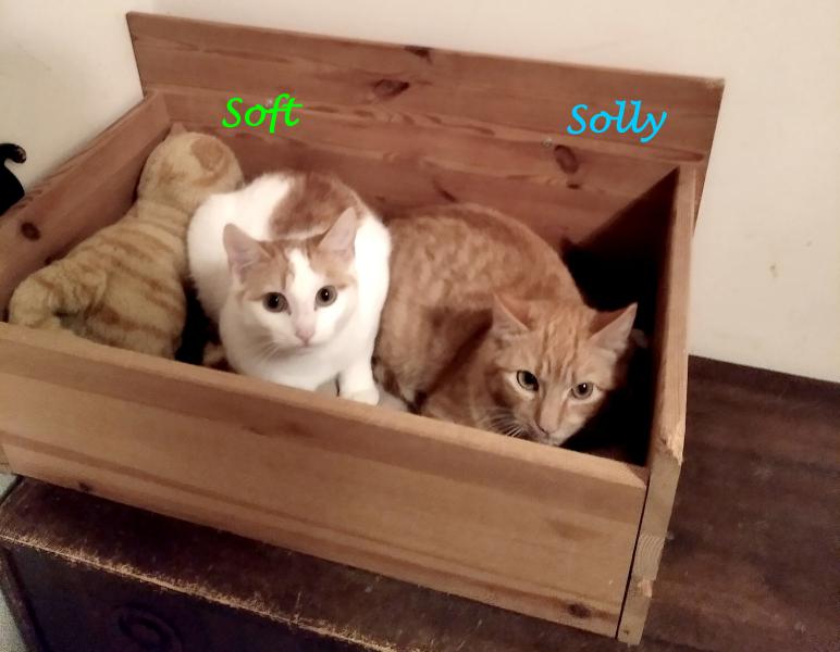 Leur histoire: Soft et Solly sont arrivés avec leur soeur et leur maman dans le jardin d’une dame qui les a nourris le temps que nous puissions les prendre en charge. La maman a été stérilisée et laissée aux bons soins de sa nourrisseuse et leur petite soeur a déjà trouvé une famille.