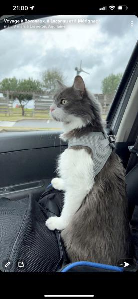 Tim est habitué à la voiture et cela ne le dérange pas, il est également habitué au port du harnais. Il a déjà voyagé avec sa maîtresse actuelle et a son passeport.