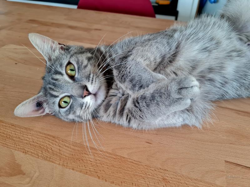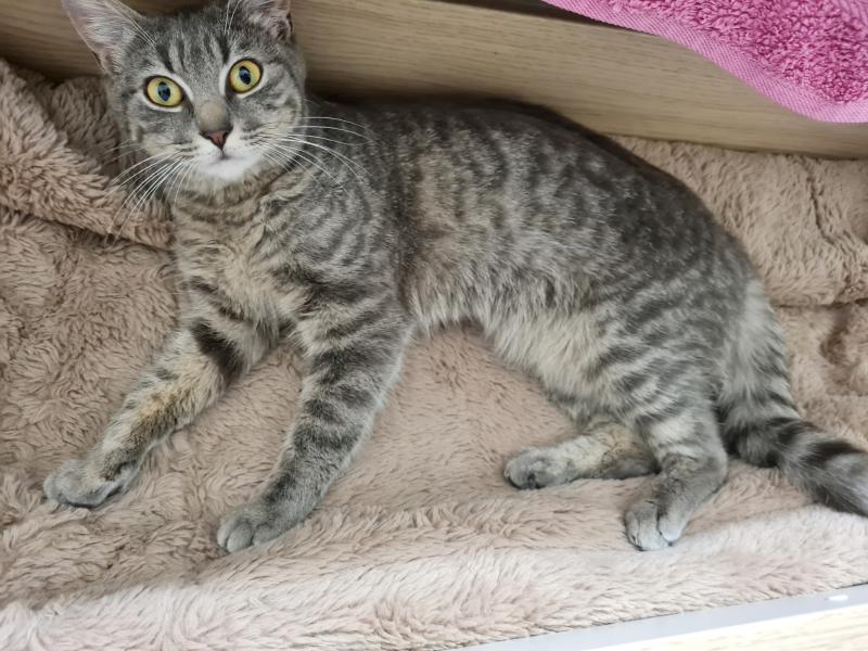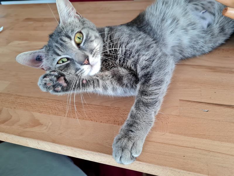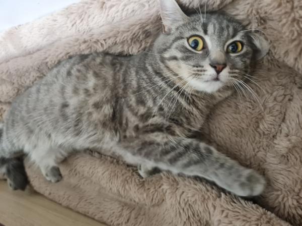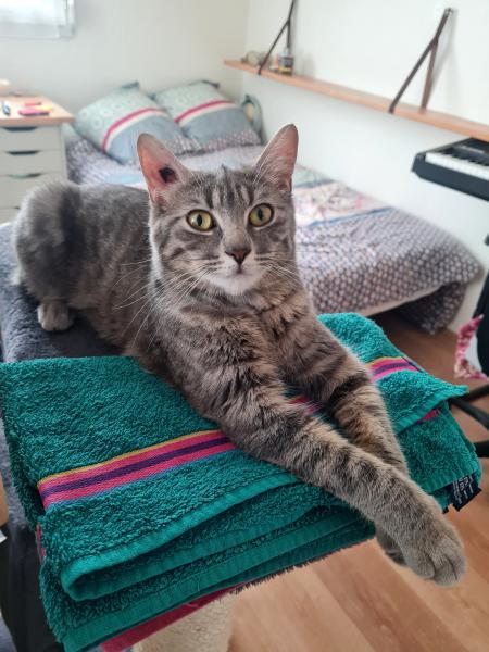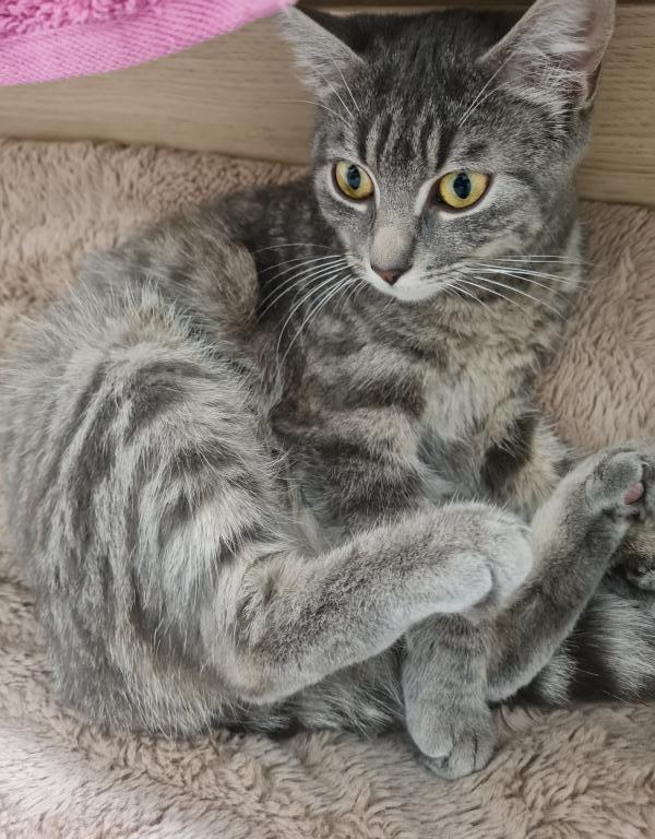 Elle ne connait pas les chiens mais sa nounou ne doute pas que l’entente pourra bien se faire. Elle est propre et fait ses griffes sur l’arbre à chat. Curieuse de nature, elle sera davantage heureuse si son logement comporte un extérieur.
