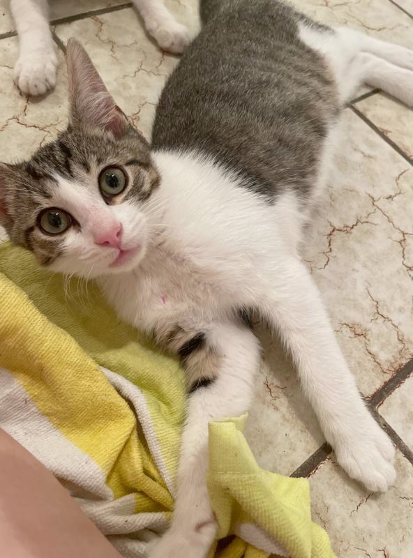 Terri est un petit chaton réservé et de nature calme qui aime les caresses mais ne vient pas les chercher de lui-même pour le moment. Bien que calme, il adore toutefois jouer avec ses congénères.