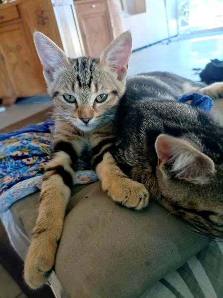 Son histoire: Titine, sa fratrie (Thaïs, Tikki, Tarzan) et leur maman ont été déposés chez l’un de nos vétérinaires partenaires.