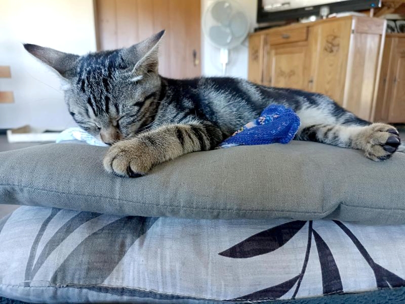 Thaïs est une gentille chatonne très sociable et proche de l’humain qui aime les caresses. Elle attend sa nounou derrière la porte pour l’accueillir quand elle arrive et adore se prélasser sur le canapé.