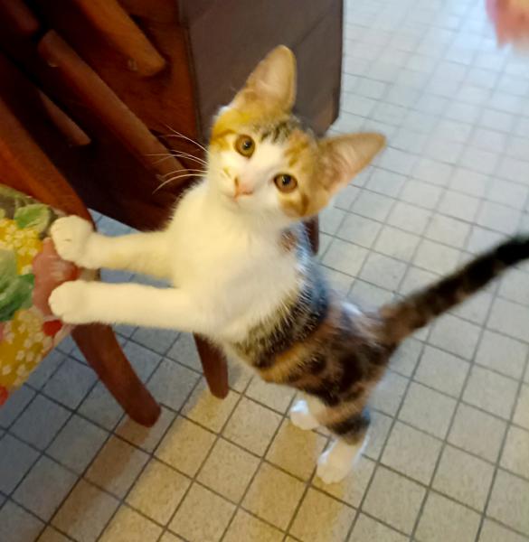 Tya est une chatonne sociable qui adore venir vers l’humain et faire du charme. Elle aime être portée et ronronne facilement dès qu’on la câline.