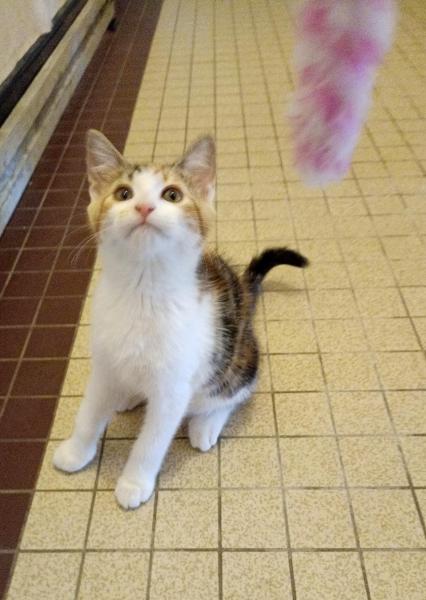 Elle adore jouer, un rien l’amuse, même une simple boule de papier. La nuit, elle aime bien comme son frère Tit’Oeuf et sa soeur Tutu dormir avec sa nounou et son mari. la journée elle s’est choisi une cachette pour « siester »: dans un rideau poisé sur un radiateur.