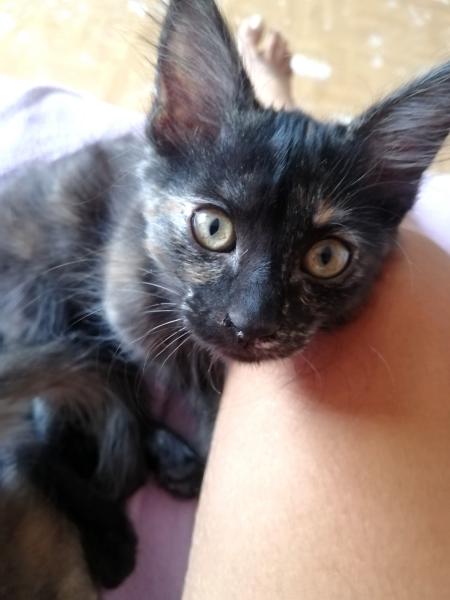 Tara est une chatonne câline. Elle aime être portée et ronronner dans le cou. Dans ses moments câlins, entre deux parties de jeu, elle aime venir se coucher contre sa nounou et la regard avec des « yeux d’amour ». Elle commence à discuter même si le miaulement n’est pas encore tout à fait au point, elle communique beaucoup.