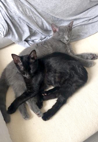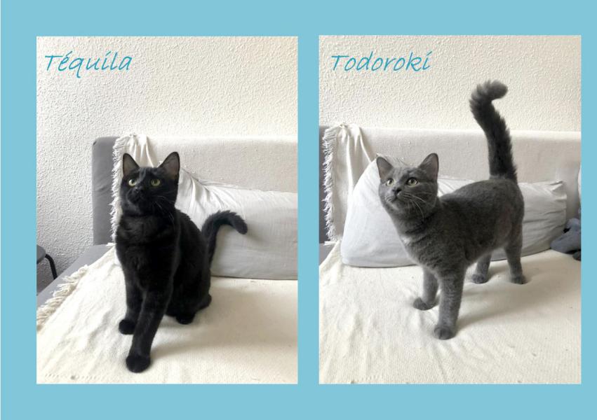 Leur histoire : Téquila et Todoroki ont été trouvés abandonnés enfermés dans un carton avec leur maman, le reste de leur portée et une compagne d’infortune, elle aussi avec ses petits, sur une zone industrielle. La petite troupe (dont huit chatons) a été sauvée grâce à une personne qui travaillait sur ce site et a entendu des miaulements venant du carton. Elle les a tous ramenés chez elle avant de nous demander de l’aider à leur trouver de gentilles familles.