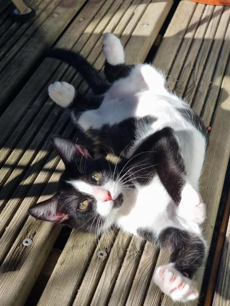 Il est tout aussi sociable avec les autres chats, ayant été notamment accompagné dès son accueil par un autre chat prêt à l’adoption, Papyrus, qui a très grandement participer à son éducation.
