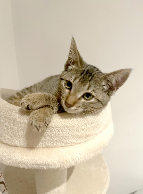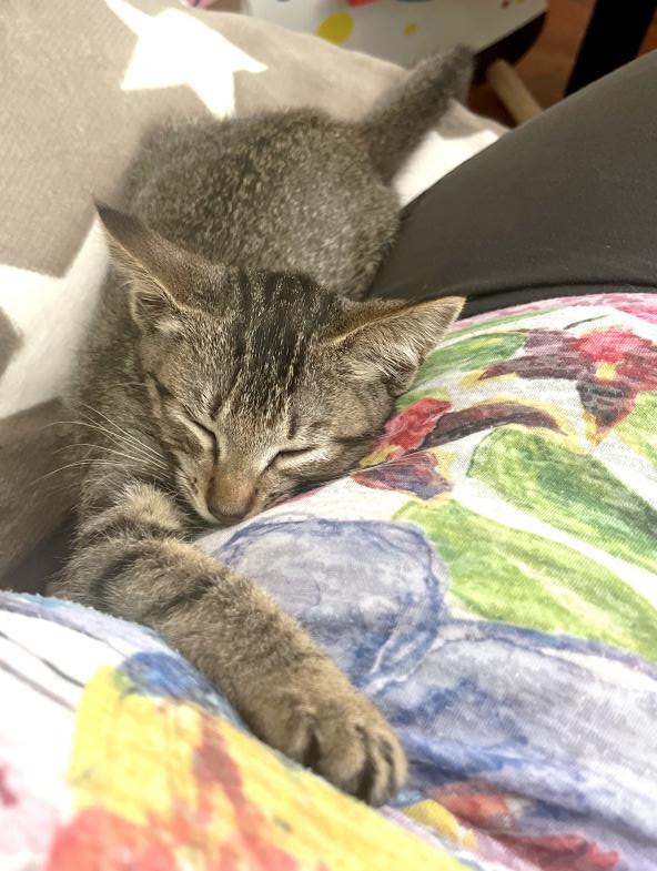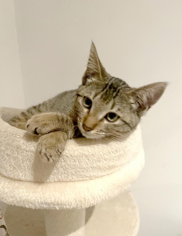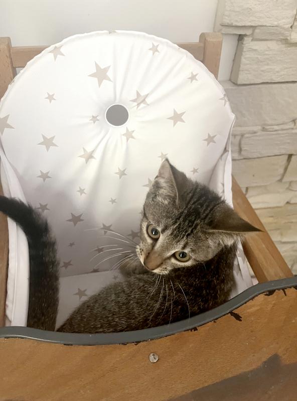 Très joueuse, elle aime emporter ses jouets à l’endroit où elle a décidé de jouer et surtout jouer avec l’humain. Elle ne fait pas de bêtises.