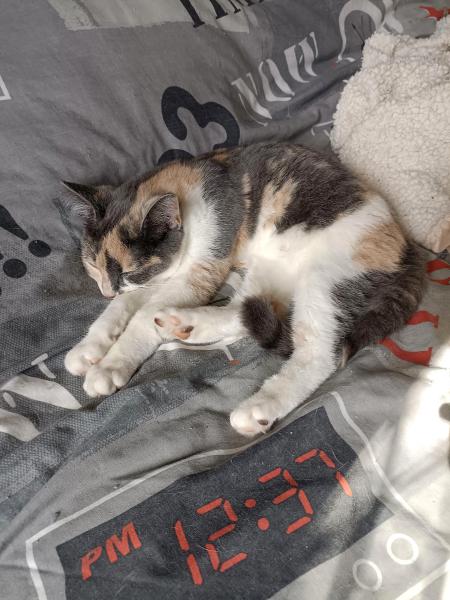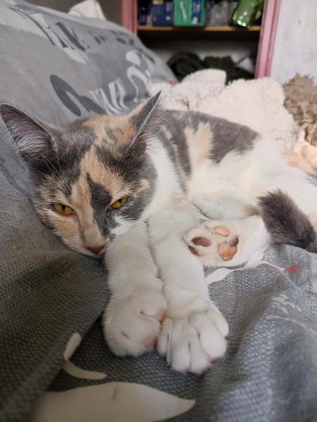 Cette grande gourmande est toujours la première à se précipiter quand elle entend le bruit d’un sachet de pâtée. Elle adore lézarder au soleil bien calée sur son arbre à chat.