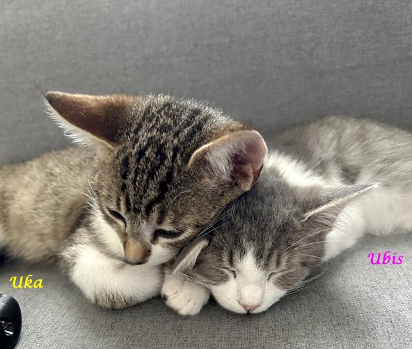 Son histoire: Uka et son frère Ubis sont nés d’une maman sauvage désormais stérilisée. Ils ont grandi auprès d’elle jusqu’à leurs deux mois. Ils ont été socialisés par la dame qui nourrit leur maman.