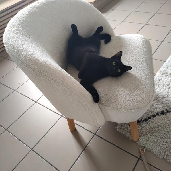 Il a peur des mouvements brusques et peut souffler sur vous s’il est surpris mais il n’agresse pas. Bien qu’il utilise le griffoir, Uno aime aussi beaucoup la tapisserie, ce sera un point à travailler.