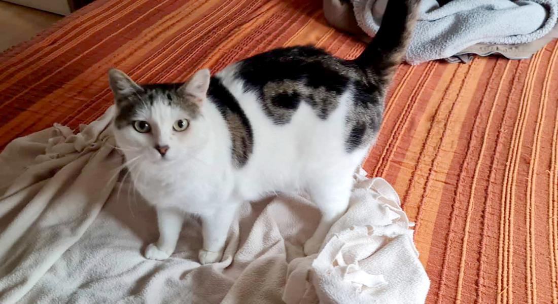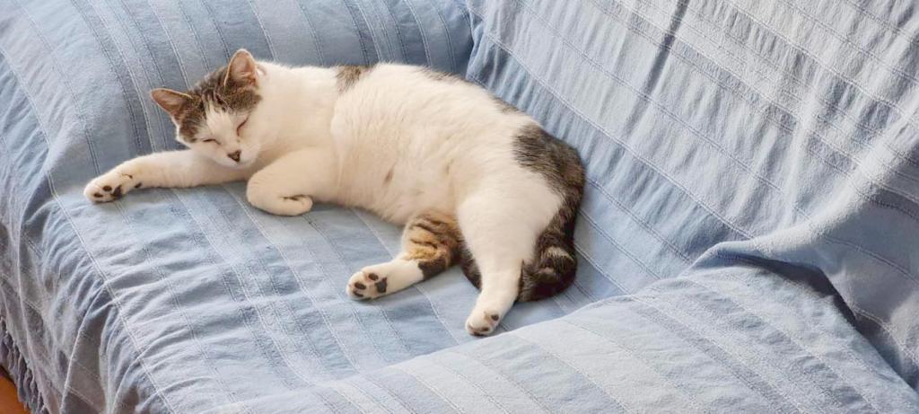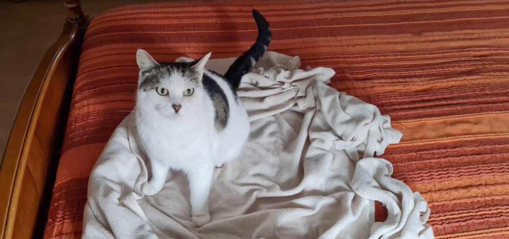 Brioche a été stérilisée à l’automne et a vécu jusqu’à l’hiver dans le jardin, ne s’éloignant jamais de la maison où elle continuait à venir manger les bonnes croquettes. Avec le froid, elle s’est décidée à venir dormir dans la chambre d’ami, tout en sortant dans la journée. Depuis que sa FA la garde à l’intérieur, elle s’en est rapprochée et a délaissé la chambre d’ami pour la chambre « commune » aux côtés de la chatte de la maison. Elle a vite pris ses aises partageant le territoire et le lit sans aucun problème.